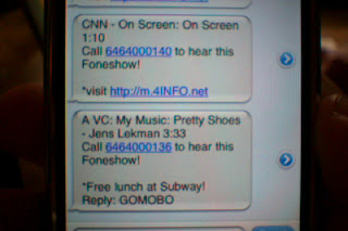 Notice the dynamically allocated phone numbers which allow the user to access an individual piece of programming. You can also clearly see the advertisements within the notification messages (these ads are provided by 4info.net, our messaging partner. If you want to advertise on Foneshow text messages let us know and we'll put you in touch with the right people at 4info).